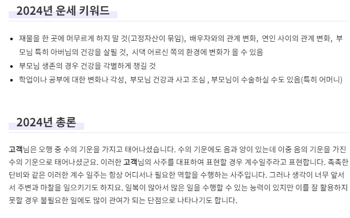 ④ 입력한 정보를 바탕으로 운세 결과가 나오며, 이를 통해 오늘의 운세, 재물운, 애정운 등을 확인할 수 있습니다.