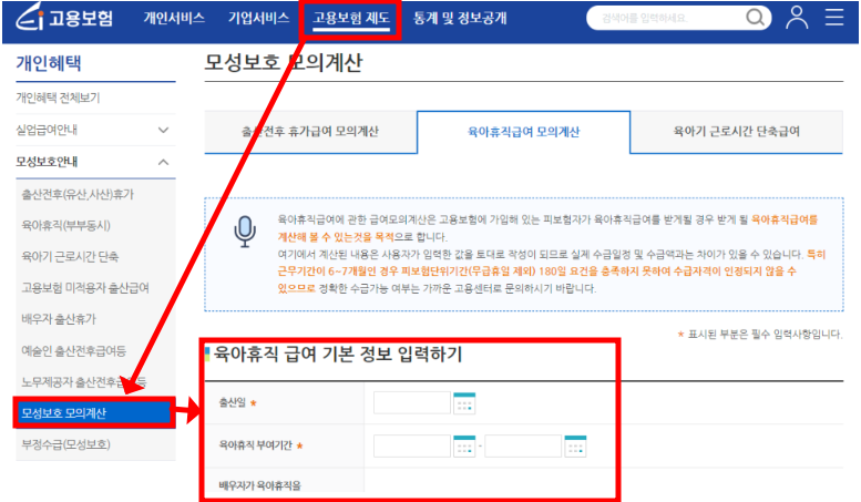 ②고용보험 제도 > 모성보호 모의계산 > 육아휴직 급여 기본정보 입력