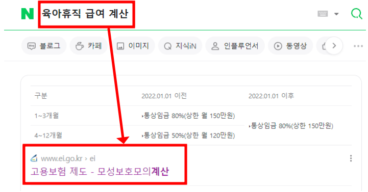 ① 네이버에서 '육아휴직 급여 계산' 검색 > 고용보험제도 - 모성보호 모의계산 선택