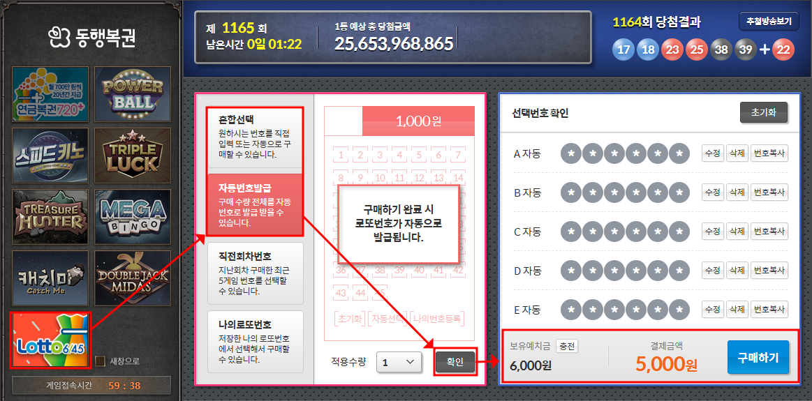 4️⃣ 자동(자동번호 발급), 수동(혼합선택), 반자동 선택 후 게임 수 지정 → 구매하기